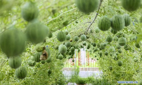 Photo taken on July 2, 2019 shows watermelons hanging on greenhouse trellises at Xintian Farm in Deqing County of Huzhou, east China's Zhejiang Province. Xintian Farm has been growing off-ground watermelons on trellises to improve the watermelons' quality and marketability. By establishing an industrial base in cooperation with Zhejiang University, the farm adopted new smart devices and systems to boost production and reduce cost. In addition, the farm plants other fruits to develop agritourism and turn itself into an eco-friendly farming facility. (Photo: Xinhua)