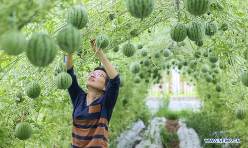 A staff member checks the conditions of off-ground watermelons at Xintian Farm in Deqing County of Huzhou, east China's Zhejiang Province, July 2, 2019. Xintian Farm has been growing off-ground watermelons on trellises to improve the watermelons' quality and marketability. By establishing an industrial base in cooperation with Zhejiang University, the farm adopted new smart devices and systems to boost production and reduce cost. In addition, the farm plants other fruits to develop agritourism and turn itself into an eco-friendly farming facility.(Photo: Xinhua)
