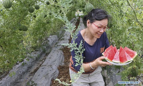 A staff member serves slices of watermelon to tourists at Xintian Farm in Deqing County of Huzhou, east China's Zhejiang Province, July 2, 2019. Xintian Farm has been growing off-ground watermelons on trellises to improve the watermelons' quality and marketability. By establishing an industrial base in cooperation with Zhejiang University, the farm adopted new smart devices and systems to boost production and reduce cost. In addition, the farm plants other fruits to develop agritourism and turn itself into an eco-friendly farming facility. (Photo: Xinhua)