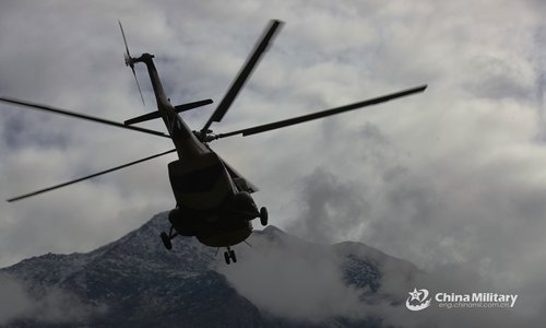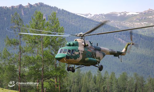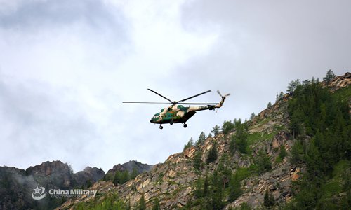 A Mi-171 transport helicopter carrying 10 soldiers prepares to land near a military post deep in the Altai Mountains along China-Mongolia border area in Altay of northwest China’s Xinjiang Autonomous Region in late June, 2019. (Photo: eng.chinamil.com.cn)