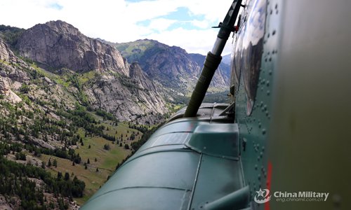 Pilots assigned to an army aviation brigade under the PLA Xinjiang Military Command navigate a Mi-171 transport helicopter through the valley to transfer 10 soldiers to a military post deep in the Altai Mountains along China-Mongolia border area in Altay of northwest China’s Xinjiang Autonomous Region in late June, 2019. (Photo: eng.chinamil.com.cn)