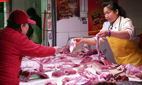 A consumer buys pork at a local market in Yunyang, Southwest China's Chongqing in February. Photo: IC