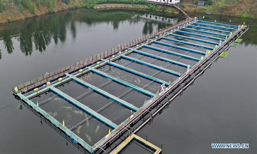 Aerial photo taken on July 25, 2019 shows terraced fields, where farmers breed fish, in Xiaozhoushan Township of Qingtian County, east China's Zhejiang Province. Since 2013, following the principle of green development, local authorities have been giving full play to over 4000 mu (about 267 hectares) terraced fields. By relying on agriculture with a history over 1000 years, Qingtian county promotes integration of agriculture, tourism and culture to develop sustainable agriculture and countryside tourism, and boost farmers' income. (Photo: Xinhua)