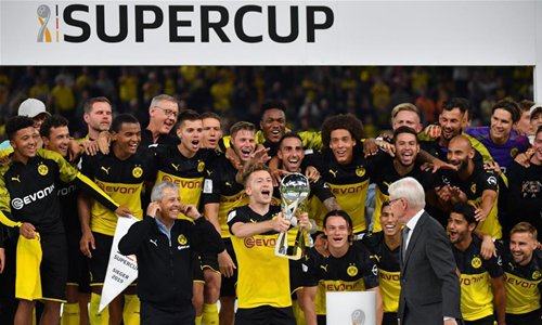 Marco Reus (down C) of Dortmund holds the trophy during the award ceremony for 2019 German Super Cup in Dortmund, Germany, on Aug. 3, 2019. Dortmund beat Bayern Munich 2-0 and claimed the title. (Photo by Ulrich Hufnagel/Xinhua)