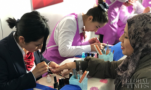 A trainee practices her manicure skills and a foreign reporter is willing to be her volunteer at a training center in Kashi, Northwest China’s Xinjiang Uyghur Autonomous Region, in February. Photo: Liu Xin/GT