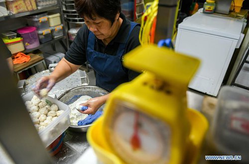 Karen Tee Kwee Ling makes Nyonya Kuih rice cakes at RizCoconut, a restaurant she runs, in Kuala Lumpur, Malaysia, Sept. 1, 2019. The Nyonya Kuih is a Malaysian steamed rice cake with a Chinese descent. Its typical ingredients include rice or glutinous rice, spices, coconut juice and plant-based pigment. In most cases the Nyonya Kuih is still made by hand, a technique adopted by the local Malaysian-Chinese community for generations. (Photo: Chong Voon Chung/Xinhua)