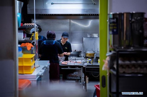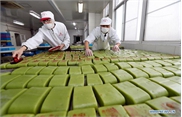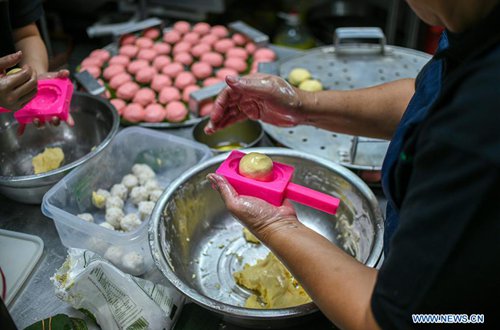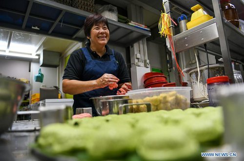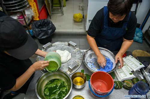 Karen Tee Kwee Ling (1st R) makes Nyonya Kuih rice cakes at RizCoconut, a restaurant she runs, in Kuala Lumpur, Malaysia, Sept. 1, 2019. The Nyonya Kuih is a Malaysian steamed rice cake with a Chinese descent. Its typical ingredients include rice or glutinous rice, spices, coconut juice and plant-based pigment. In most cases the Nyonya Kuih is still made by hand, a technique adopted by the local Malaysian-Chinese community for generations.(Photo: Xinhua)
