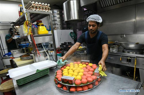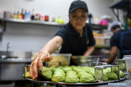 A staff member of the restaurant RizCoconut puts an assortment of Nyonya Kuih rice cakes into a steamer in Kuala Lumpur, Malaysia, Sept. 1, 2019. The Nyonya Kuih is a Malaysian steamed rice cake with a Chinese descent. Its typical ingredients include rice or glutinous rice, spices, coconut juice and plant-based pigment. In most cases the Nyonya Kuih is still made by hand, a technique adopted by the local Malaysian-Chinese community for generations. (Photo: Chong Voon Chung/Xinhua)