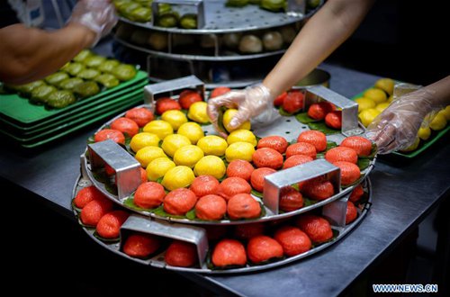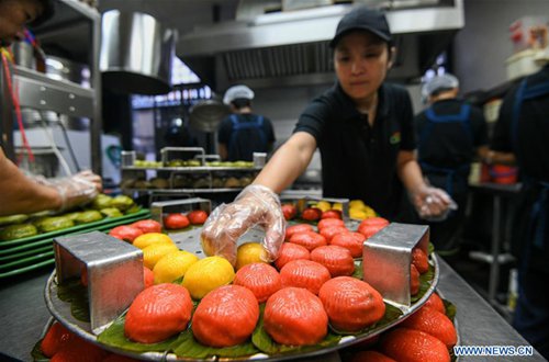 Karen Tee Kwee Ling (R) and her mother Linda Yau Sew Luan arrange Nyonya Kuih rice cakes on plates at RizCoconut, a restaurant she runs, in Kuala Lumpur, Malaysia, Sept. 1, 2019. The Nyonya Kuih is a Malaysian steamed rice cake with a Chinese descent. Its typical ingredients include rice or glutinous rice, spices, coconut juice and plant-based pigment. In most cases the Nyonya Kuih is still made by hand, a technique adopted by the local Malaysian-Chinese community for generations. (Photo: Xinhua)