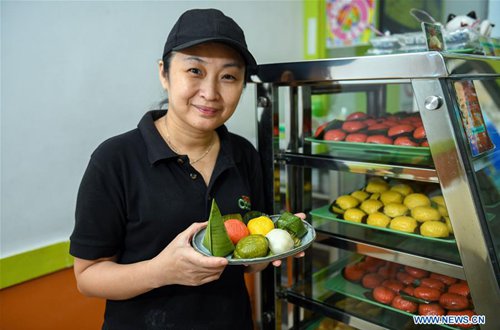 Karen Tee Kwee Ling arranges Nyonya Kuih rice cakes on plates at RizCoconut, a restaurant she runs, in Kuala Lumpur, Malaysia, Sept. 1, 2019. The Nyonya Kuih is a Malaysian steamed rice cake with a Chinese descent. Its typical ingredients include rice or glutinous rice, spices, coconut juice and plant-based pigment. In most cases the Nyonya Kuih is still made by hand, a technique adopted by the local Malaysian-Chinese community for generations. (Photo: Chong Voon Chung/Xinhua)