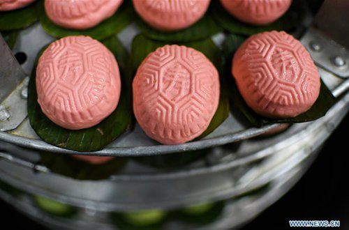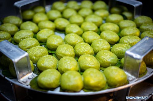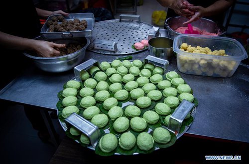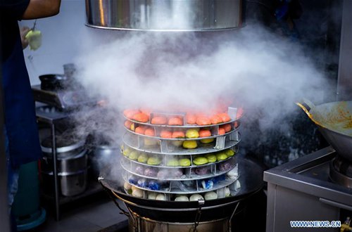 A staff member of the restaurant RizCoconut removes an assortment of Nyonya Kuih rice cakes from a steamer in Kuala Lumpur, Malaysia, Sept. 1, 2019. The Nyonya Kuih is a Malaysian steamed rice cake with a Chinese descent. Its typical ingredients include rice or glutinous rice, spices, coconut juice and plant-based pigment. In most cases the Nyonya Kuih is still made by hand, a technique adopted by the local Malaysian-Chinese community for generations. (Photo: Chong Voon Chung/Xinhua)