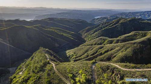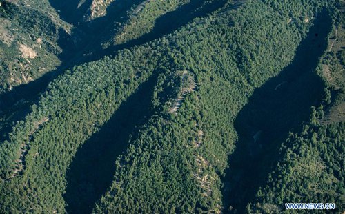 Aerial photo taken on Oct. 2, 2010 shows the scenery of Nanniwan in Baota District of Yan'an, northwest China's Shaanxi Province. The city of Yan'an on the Loess Plateau, where 258 million tonnes of mud and sand were once washed into the Yellow River each year, has seen its landscape improve greatly. Since 1999, local government has returned 718,307 hectares of farmland to forests, increasing the local vegetation coverage rate from 46 percent in 2000 to over 80 percent at present. Data showed that the city reported fewer sand and dust days in recent years, and the annual amount of mud and sand washed into the Yellow River has been slashed by 88 percent to 31 million tonnes. (Photo: Xinhua)