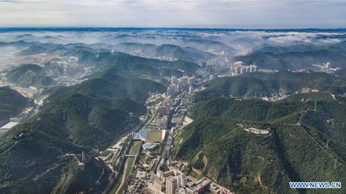 Aerial photo taken on Oct. 2, 2010 shows the scenery of Fenghuang Mountain in Yan'an, northwest China's Shaanxi Province. The city of Yan'an on the Loess Plateau, where 258 million tonnes of mud and sand were once washed into the Yellow River each year, has seen its landscape improve greatly. Since 1999, local government has returned 718,307 hectares of farmland to forests, increasing the local vegetation coverage rate from 46 percent in 2000 to over 80 percent at present. Data showed that the city reported fewer sand and dust days in recent years, and the annual amount of mud and sand washed into the Yellow River has been slashed by 88 percent to 31 million tonnes.(Photo: Xinhua)