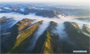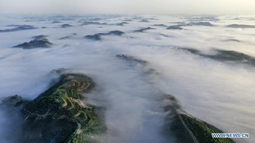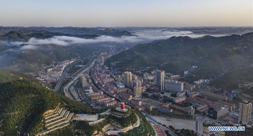 Aerial photo taken on June 6, 2019 shows the clouds floating over Zoumatai Village in Wuqi County of Yan'an, northwest China's Shaanxi Province. The city of Yan'an on the Loess Plateau, where 258 million tonnes of mud and sand were once washed into the Yellow River each year, has seen its landscape improve greatly. Since 1999, local government has returned 718,307 hectares of farmland to forests, increasing the local vegetation coverage rate from 46 percent in 2000 to over 80 percent at present. Data showed that the city reported fewer sand and dust days in recent years, and the annual amount of mud and sand washed into the Yellow River has been slashed by 88 percent to 31 million tonnes. (Photo: Xinhua)