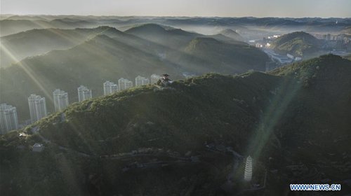 Aerial photo taken on Aug. 29, 2019 shows Baota Mountain in Yan'an, northwest China's Shaanxi Province. The city of Yan'an on the Loess Plateau, where 258 million tonnes of mud and sand were once washed into the Yellow River each year, has seen its landscape improve greatly. Since 1999, local government has returned 718,307 hectares of farmland to forests, increasing the local vegetation coverage rate from 46 percent in 2000 to over 80 percent at present. Data showed that the city reported fewer sand and dust days in recent years, and the annual amount of mud and sand washed into the Yellow River has been slashed by 88 percent to 31 million tonnes. (Photo: Xinhua)