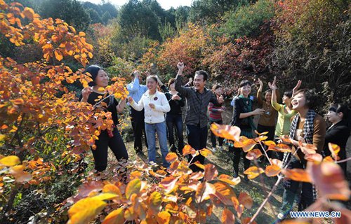 Tourists enjoy themselves at Mangtoushan National Forest Park in Yan'an, northwest China's Shaanxi Province, Oct. 15, 2009. The city of Yan'an on the Loess Plateau, where 258 million tonnes of mud and sand were once washed into the Yellow River each year, has seen its landscape improve greatly. Since 1999, local government has returned 718,307 hectares of farmland to forests, increasing the local vegetation coverage rate from 46 percent in 2000 to over 80 percent at present. Data showed that the city reported fewer sand and dust days in recent years, and the annual amount of mud and sand washed into the Yellow River has been slashed by 88 percent to 31 million tonnes.(Photo: Xinhua)