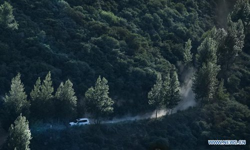 A car drives on the mountain road at Zoumatai Village of Wuqi County in Yan'an City, northwest China's Shaanxi Province, June 5, 2019. The city of Yan'an on the Loess Plateau, where 258 million tonnes of mud and sand were once washed into the Yellow River each year, has seen its landscape improve greatly. Since 1999, local government has returned 718,307 hectares of farmland to forests, increasing the local vegetation coverage rate from 46 percent in 2000 to over 80 percent at present. Data showed that the city reported fewer sand and dust days in recent years, and the annual amount of mud and sand washed into the Yellow River has been slashed by 88 percent to 31 million tonnes. (Photo: Xinhua)