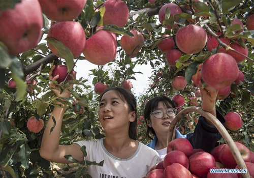 Farmers pick apples in Yongxiang Township of Luochuan County, northwest China's Shaanxi Province, Aug. 28, 2019. The city of Yan'an on the Loess Plateau, where 258 million tonnes of mud and sand were once washed into the Yellow River each year, has seen its landscape improve greatly. Since 1999, local government has returned 718,307 hectares of farmland to forests, increasing the local vegetation coverage rate from 46 percent in 2000 to over 80 percent at present. Data showed that the city reported fewer sand and dust days in recent years, and the annual amount of mud and sand washed into the Yellow River has been slashed by 88 percent to 31 million tonnes. (Photo: Xinhua)