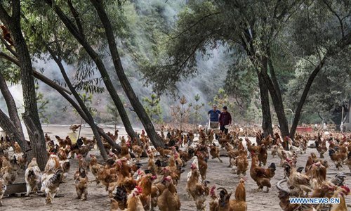 A couple feed chickens at Leipingta Village in Ansai District of Yan'an, northwest China's Shaanxi Province, Aug. 27, 2019. The city of Yan'an on the Loess Plateau, where 258 million tonnes of mud and sand were once washed into the Yellow River each year, has seen its landscape improve greatly. Since 1999, local government has returned 718,307 hectares of farmland to forests, increasing the local vegetation coverage rate from 46 percent in 2000 to over 80 percent at present. Data showed that the city reported fewer sand and dust days in recent years, and the annual amount of mud and sand washed into the Yellow River has been slashed by 88 percent to 31 million tonnes. (Photo: Xinhua)