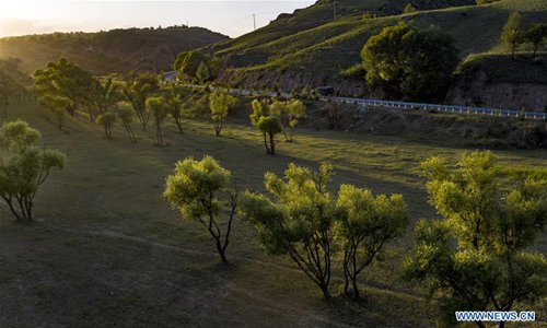 Aerial photo taken on Aug. 10, 2019 shows a view of Ansai District of Yan'an, northwest China's Shaanxi Province. The city of Yan'an on the Loess Plateau, where 258 million tonnes of mud and sand were once washed into the Yellow River each year, has seen its landscape improve greatly. Since 1999, local government has returned 718,307 hectares of farmland to forests, increasing the local vegetation coverage rate from 46 percent in 2000 to over 80 percent at present. Data showed that the city reported fewer sand and dust days in recent years, and the annual amount of mud and sand washed into the Yellow River has been slashed by 88 percent to 31 million tonnes. (Photo: Xinhua)