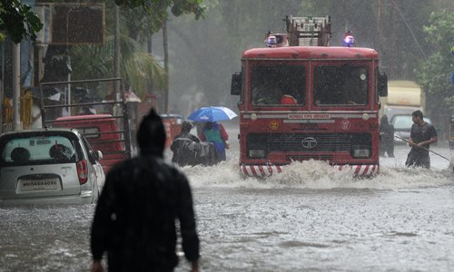 A fire engine drives through a flooded road during heavy rain showers in Mumbai, India on Wednesday. Three people were killed and dozens of flights were cancelled or delayed after severe flooding in India's financial hub Mumbai, with authorities warning of more heavy monsoon rains on Thursday. Photo: AFP