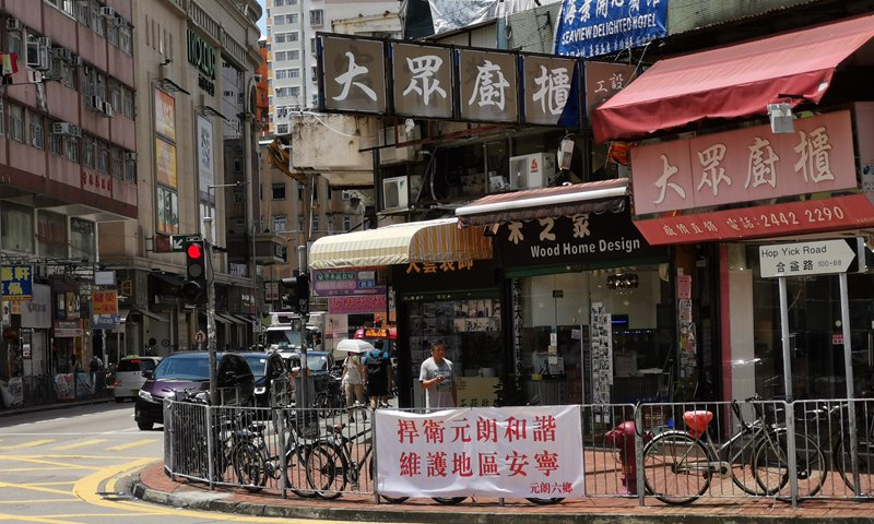 A banner with the words "Defend Yuen Long's harmony and maintain regional tranquility" is displayed on a street in Yuen Long, Hong Kong on July 23. Photo: Yang Sheng/GT