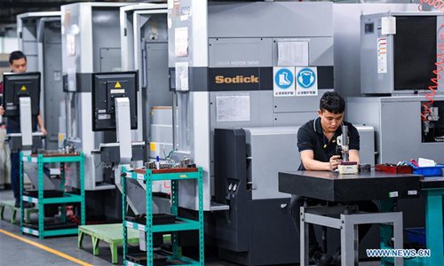 Workers are seen at a workshop in Longhua science and technology park of Foxconn Technology Group in Shenzhen, south China's Guangdong Province, Feb. 22, 2019. (Xinhua/Mao Siqian)