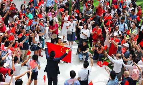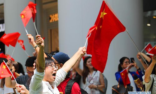 People participate in a flash mob at Olympian City in Hong Kong, south China, Sep 13, 2019. People chorused the Chinese national anthem during a flash mob in Hong Kong to celebrate the Mid-Autumn Festival on Friday.Photo:Xinhua