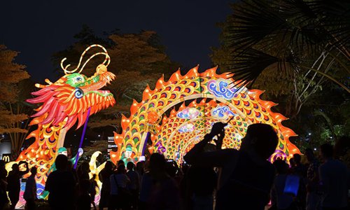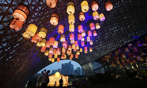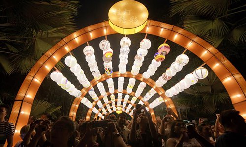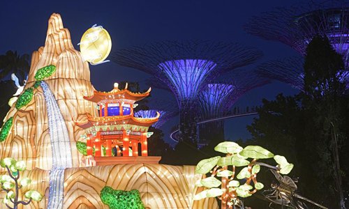 People view light installations during the Mid-Autumn Festival celebrations held in Gardens by the Bay in Singapore, Sep 13, 2019.Photo:Xinhua