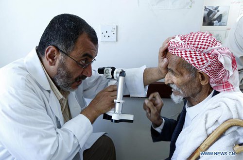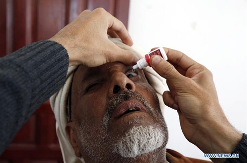 A man with eye illness receives treatment during a medical campaign in Sanaa, Yemen, Sept. 16, 2019. A five-day medical campaign was launched on Sunday to provide free examination and surgery for people with eye illnesses. (Photo: Mohammed Mohammed/Xinhua)