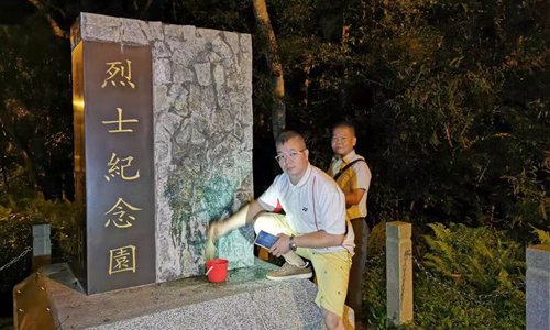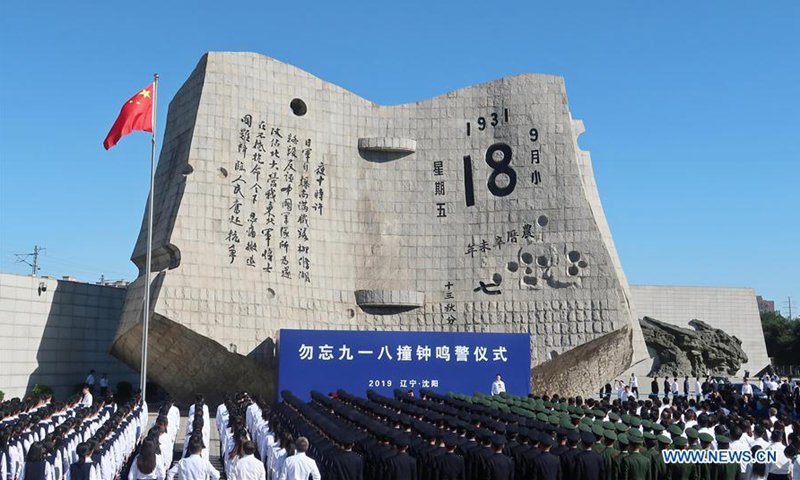 Visitors holding Chinese national flags have their photos taken in front of the 9.18 Historical Museum in Shenyang, Northeast China's Liaoning Province on Wednesday. Air raid sirens once again sounded through the city at 9:18 am on Wednesday. The "September 18 Incident" in 1931 was followed by Japan's full-scale invasion of China, triggering the 14-year-long war against Japanese aggression. Photo: IC