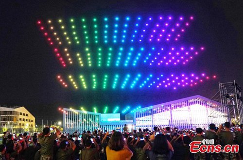 Photo taken on Sept. 17, 2019 shows a drone display at the Tianmu Lake Campus of Nanjing University of Aeronautics and Astronautics in Nanjing, Jiangsu Province as part of celebrations to mark the 70th anniversary of the founding of the People’s Republic of China. As music played, 300 drones took off to form Chinese characters such as Love China or iconic patterns including Tiananmen. (Photo: China News Service/Yang Bo) Photo taken on Sept. 17, 2019 shows a drone display at the Tianmu Lake Campus of Nanjing University of Aeronautics and Astronautics in Nanjing, Jiangsu Province as part of celebrations to mark the 70th anniversary of the founding of the People’s Republic of China. As music played, 300 drones took off to form Chinese characters such as Love China or iconic patterns including Tiananmen. (Photo: China News Service)