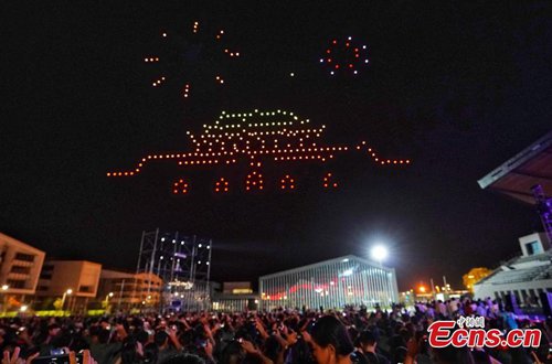 Photo taken on Sept. 17, 2019 shows a drone display at the Tianmu Lake Campus of Nanjing University of Aeronautics and Astronautics in Nanjing, Jiangsu Province as part of celebrations to mark the 70th anniversary of the founding of the People’s Republic of China. As music played, 300 drones took off to form Chinese characters such as Love China or iconic patterns including Tiananmen. (Photo: Ecns.cn)