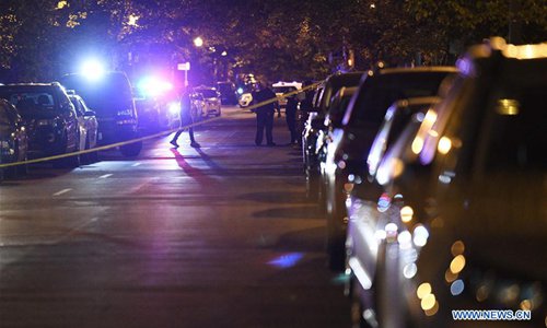 Police officers stand guard near the shooting scene in Washington D.C., the United States, on Sept. 19, 2019. One person was killed and five others were injured in a shooting Thursday night in northern Washington D.C., police said. (Xinhua/Liu Jie)