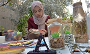 Palestinian artist Manal Al-Astal shows her paints on jeans inside her house in the southern Gaza Strip city of Khan Younis, Sept. 19, 2019. (Photo: Mohammed Dahman/Xinhua)
