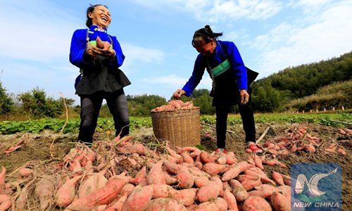 Farmers collect sweet potatoes in Santuan Village, Miao Autonomous County of Rongshui, south China's Guangxi Zhuang Autonomous Region, Oct. 24, 2017.Photo:Xinhua