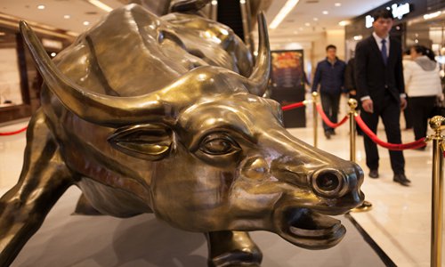 A bull sculpture that looks very much like the one on Wall Street is seen in a shopping mall in Beijing near the offices of the China Securities Regulatory Commission on Wednesday. The sculpture attracts many people passing by, and Chinese investors joke that "this is the place" for the sculpture. Photo: CFP