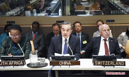 Chinese State Councilor and Foreign Minister Wang Yi addresses the commemoration of the 70th anniversary of the signing of the Geneva Conventions at the UN headquarters in New York, Sept. 23, 2019. (Xinhua/Han Fang)