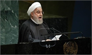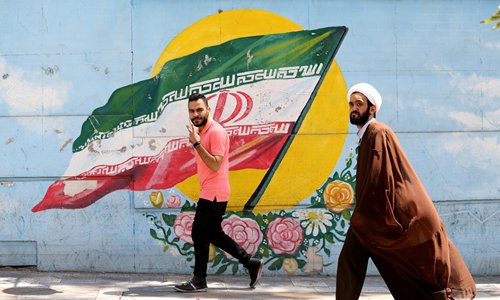 An Iranian cleric and a young man walk past a mural of the national flag in Tehran on Tuesday. Iranian President Hassan Rouhani told the US to "take the first step" by lifting all sanctions against Iran, dampening the likelihood of meeting US President Donald Trump. Photo: AFP