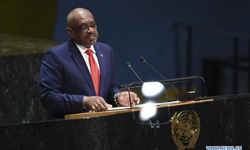 Prime Minister of the Bahamas Hubert Minnis addresses the General Debate of the 74th session of the UN General Assembly at the UN headquarters in New York, on Sept. 27, 2019. (Xinhua/Han Fang)