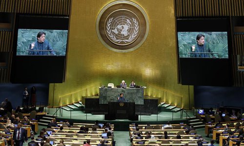 Pakistani Prime Minister Imran Khan (C) addresses the General Debate of the 74th session of the UN General Assembly at the UN headquarters in New York, on Sept. 27, 2019. (Xinhua/Li Muzi)