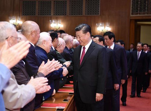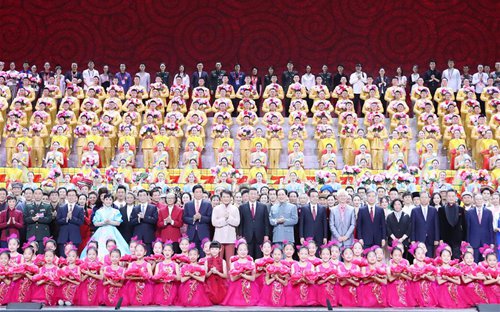 Xi Jinping and other leaders pose for a group photo with cast members after a high-profile art performance, named "Stride Forward, the Nation," at the Great Hall of the People in Beijing, capital of China, Sept. 29, 2019. The performance was held here on Sunday evening in celebration of the 70th founding anniversary of the People's Republic of China. Xi Jinping, Li Keqiang, Li Zhanshu, Wang Yang, Wang Huning, Zhao Leji, Han Zheng and Wang Qishan joined over 4,000 people to watch the performance. (Photo: Xinhua)