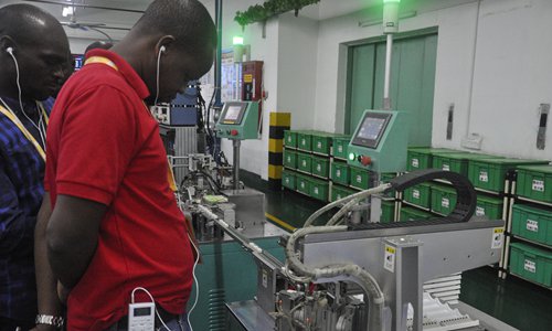 African members of the BRNN Media Workshop visit an assembly line of Galanz microwave oven in Shunde, South China’s Guangdong Province. Photo: Li Lei/GT