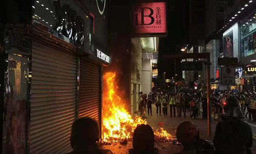 Rioters set fire at MTR station at Causeway Bay on Friday night. Photo: Chen Qingqing/GT
