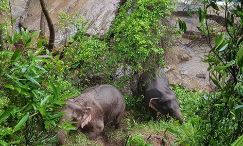 Two elephant survivors are seen at the base of Haew Narok waterfall in Khao Yai National Park in northeastern Thailand , Oct . 5, 2019. (Photos courtesy of the Department of National Parks, Wildlife and Plant Conservation)
