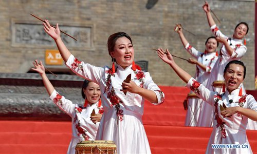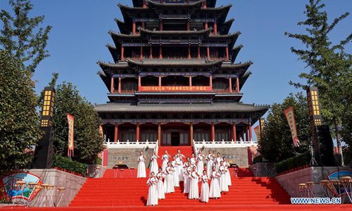 Artists perform during the opening ceremony of the cultural week to worship the legendary ancestor Huangdi, or the Yellow Emperor, in Qian'an, north China's Hebei Province, Oct. 7, 2019. (Xinhua/Yang Shiyao)