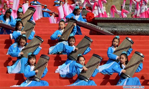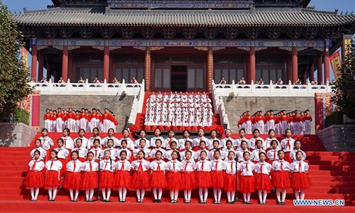 Children chorus during the opening ceremony of the cultural week to worship the legendary ancestor Huangdi, or the Yellow Emperor, in Qian'an, north China's Hebei Province, Oct. 7, 2019. (Xinhua/Yang Shiyao)