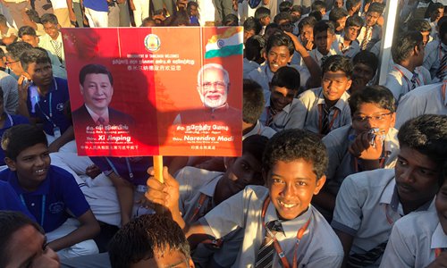 Students from Mamallapuram, an ancient coastal town in southeastern India, welcome Chinese President Xi Jinping on Friday. Photo: Cao Siqi/GT