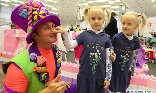 Twin sisters take part in a festival of twins held in Minsk, Belarus, Oct. 12, 2019. A total of 150 families of twins and multiples took part in the event. (Xinhua)