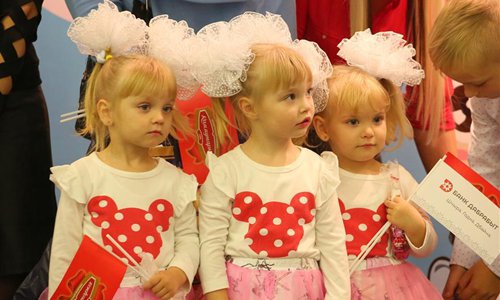 Triplet sisters take part in a festival of twins held in Minsk, Belarus, Oct. 12, 2019. A total of 150 families of twins and multiples took part in the event. (Xinhua)